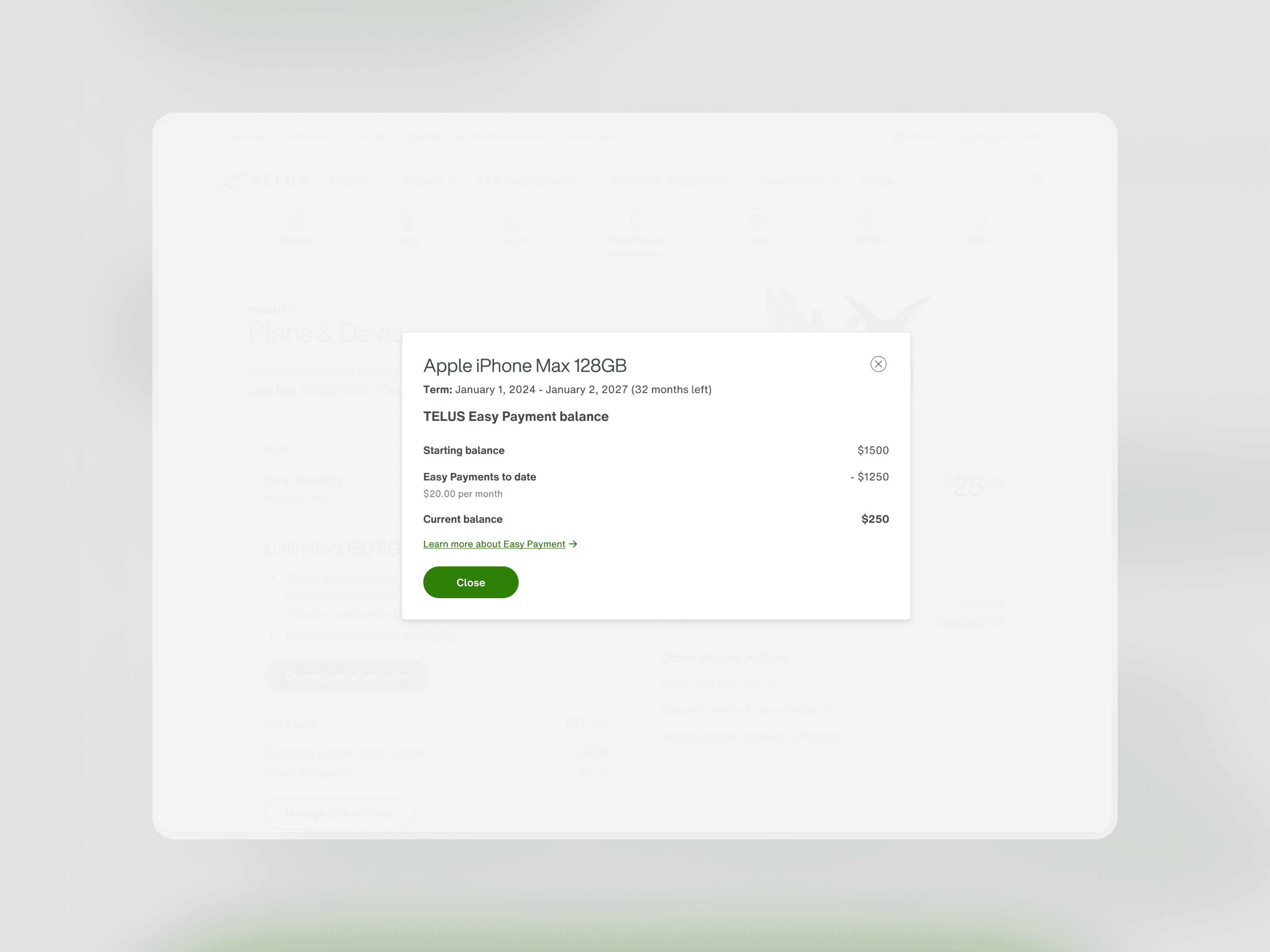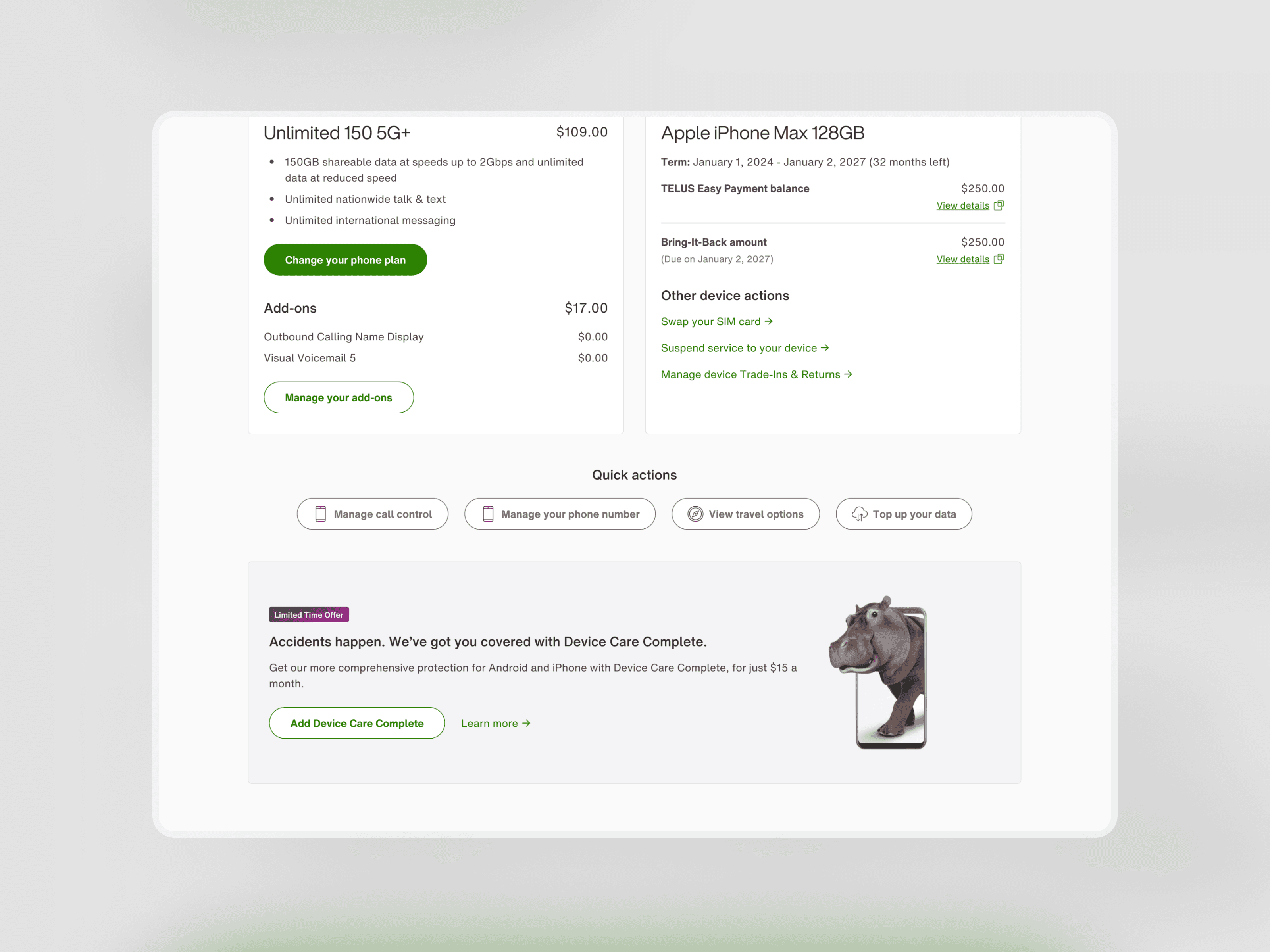 A commerce flow allowing customers to shop for mobility plans and add-ons for their individual usage