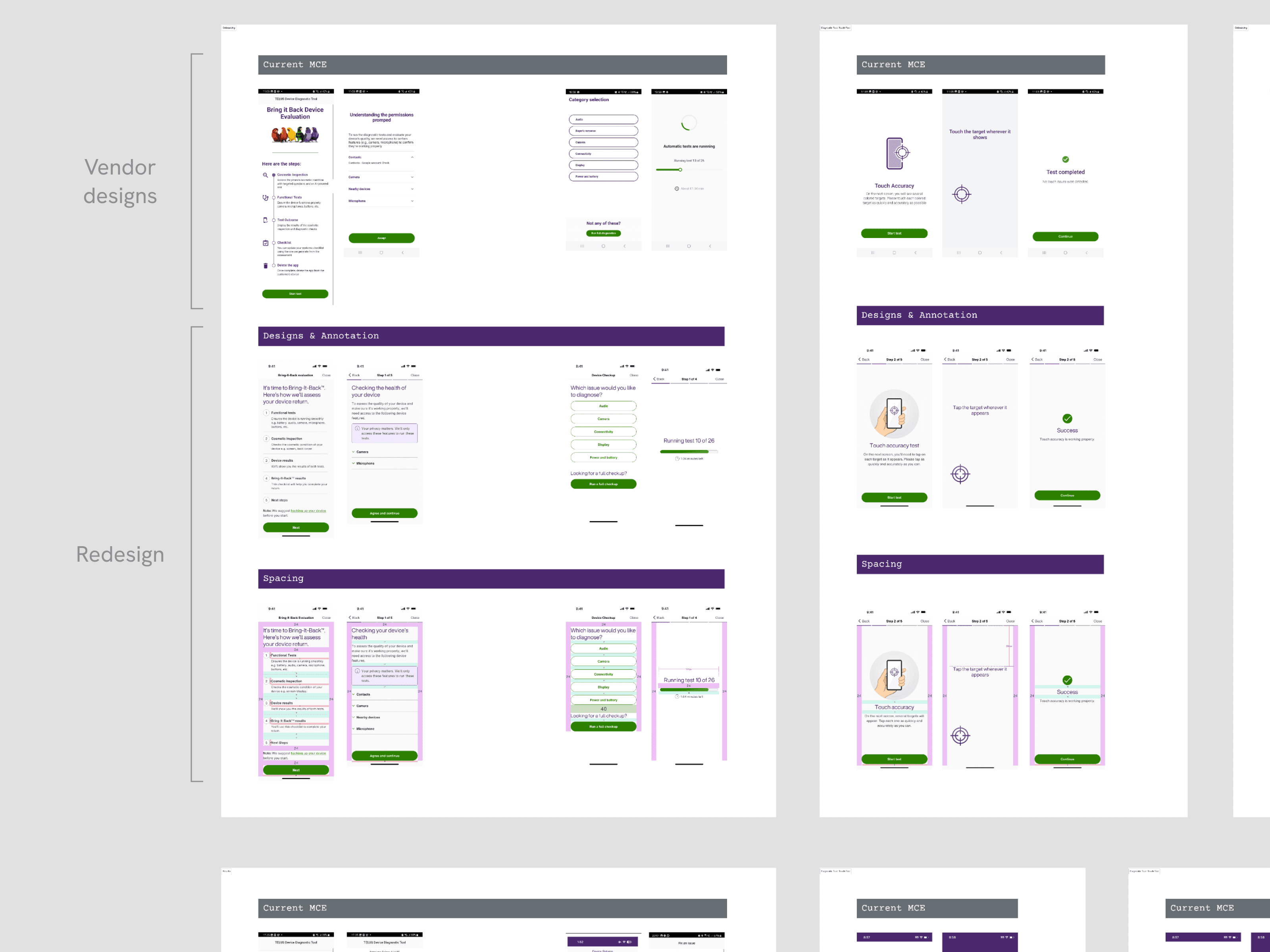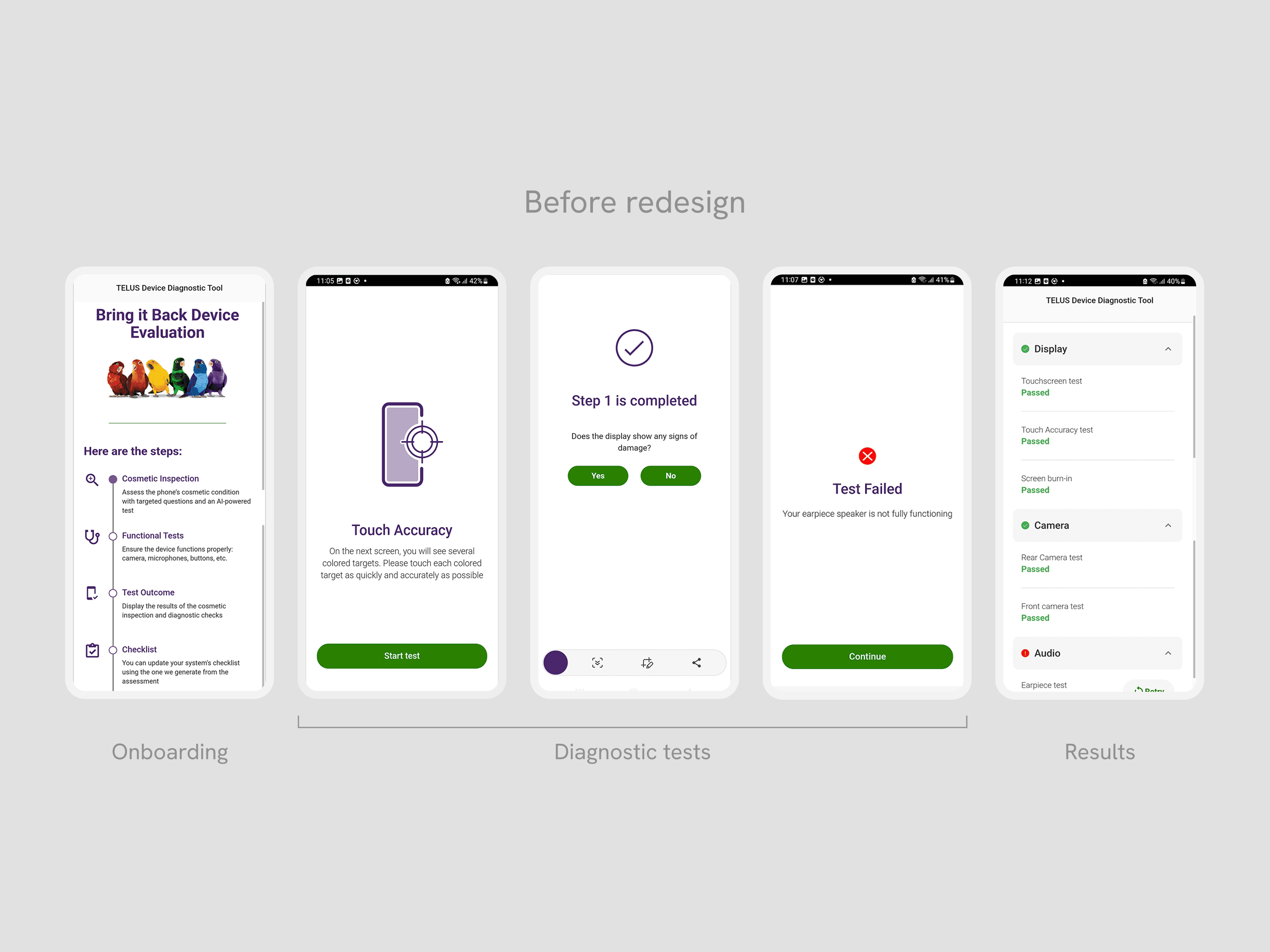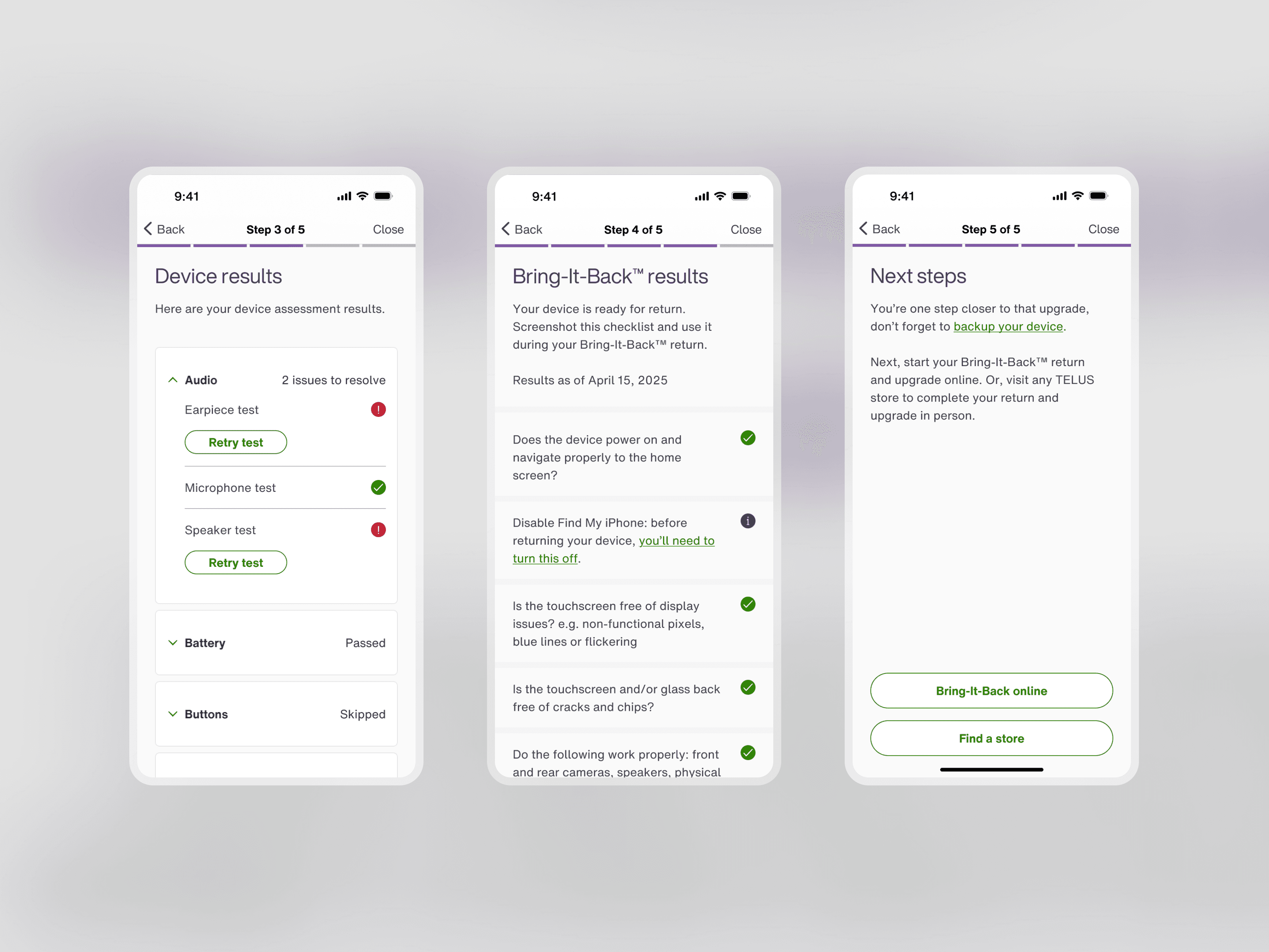 The Device Checkup integration is an automated diagnostic tool, created by a third-party vendor, that allows users to self-assess their phone’s hardware and software health for trade-ins and repairs. I redesigned the third-party flow to meet TELUS accessibility and branding standards, ensuring users could accurately value their devices through a seamless journey.