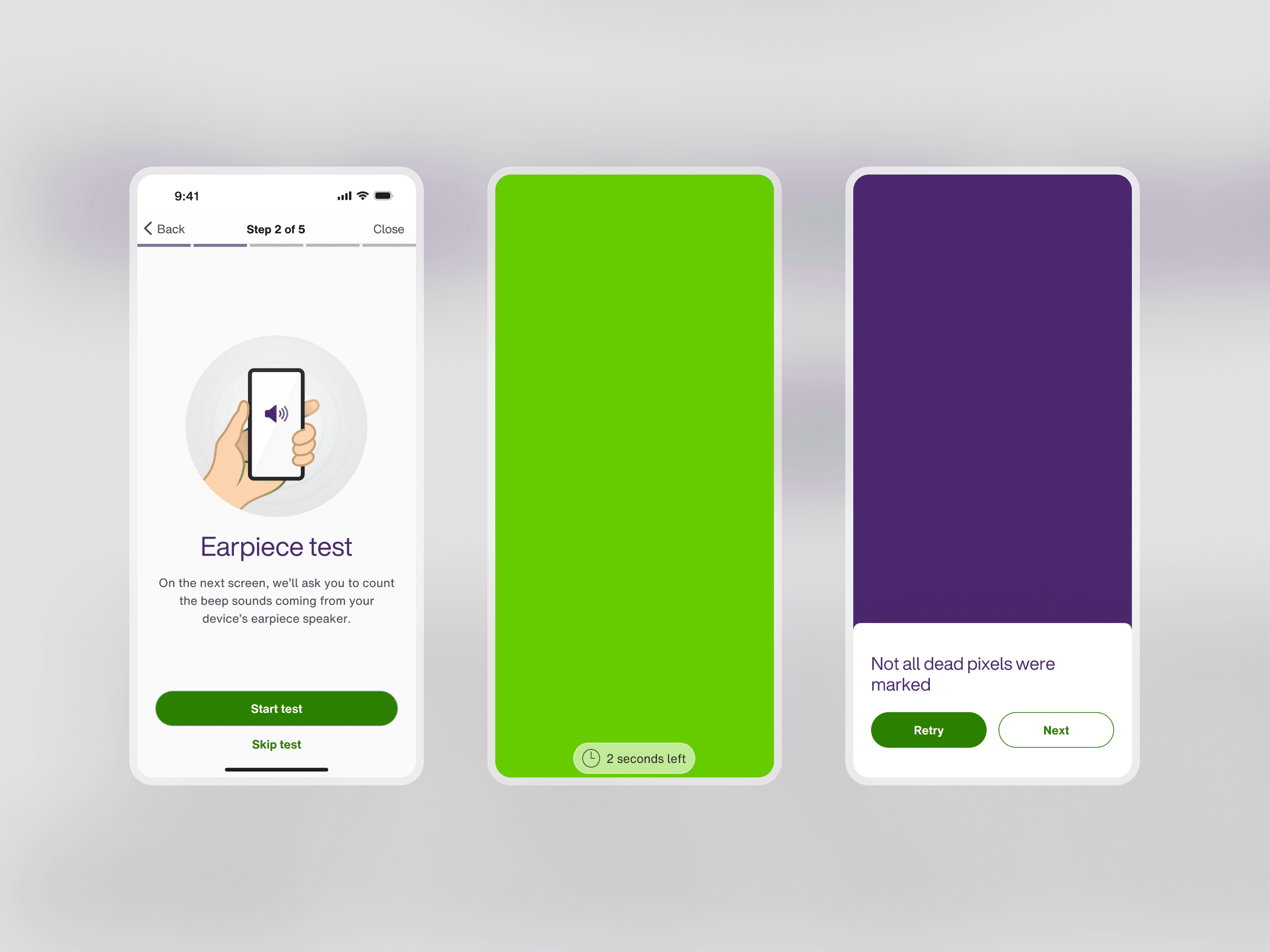 The diagnostic tests were optimized by introducing flexible test logic (skipping and retesting) and improving visual feedback and contrast. By allowing users to skip tests, we ensured that non-ideal test environments wouldn't result in unfairly low assessment results.