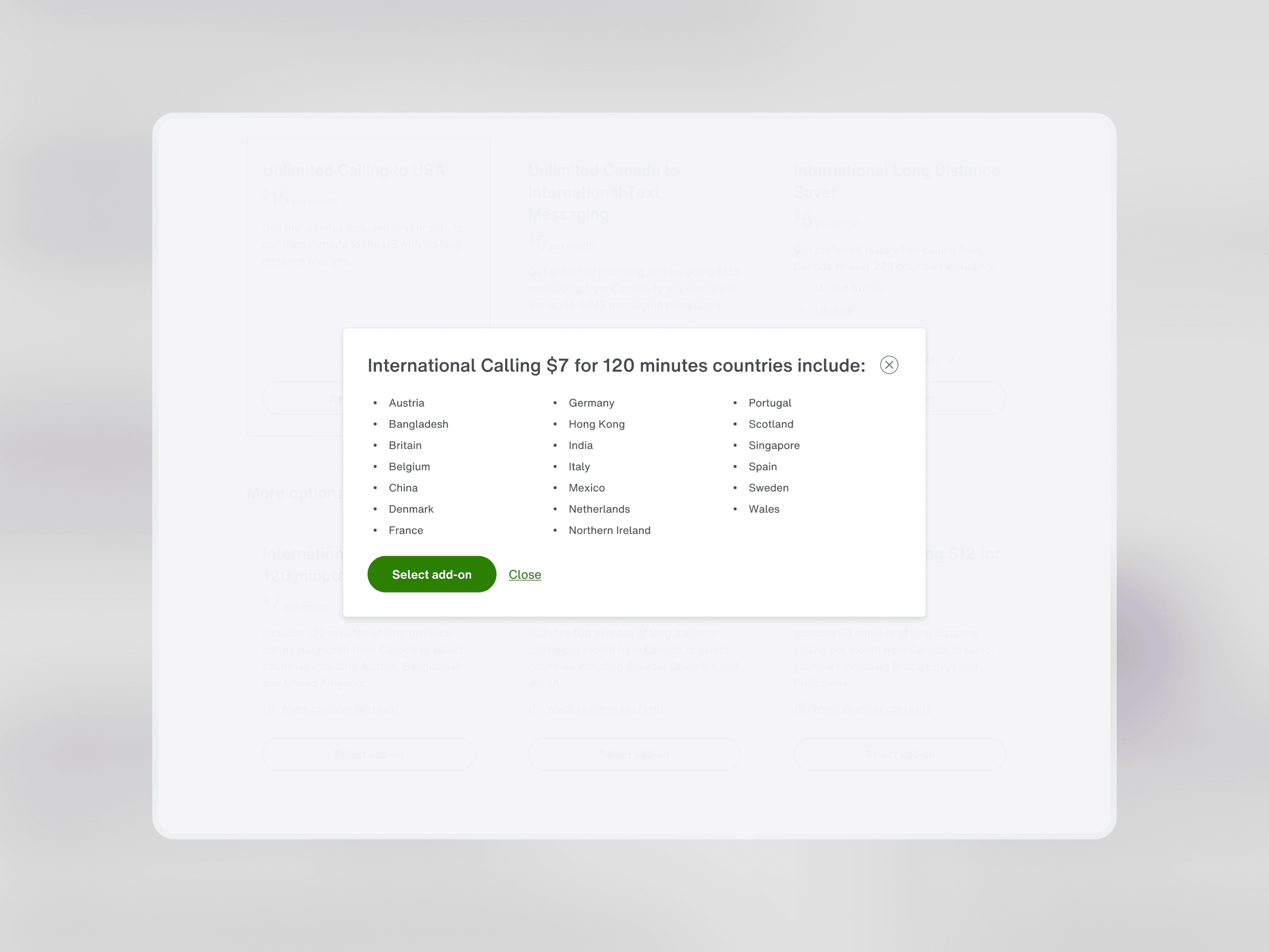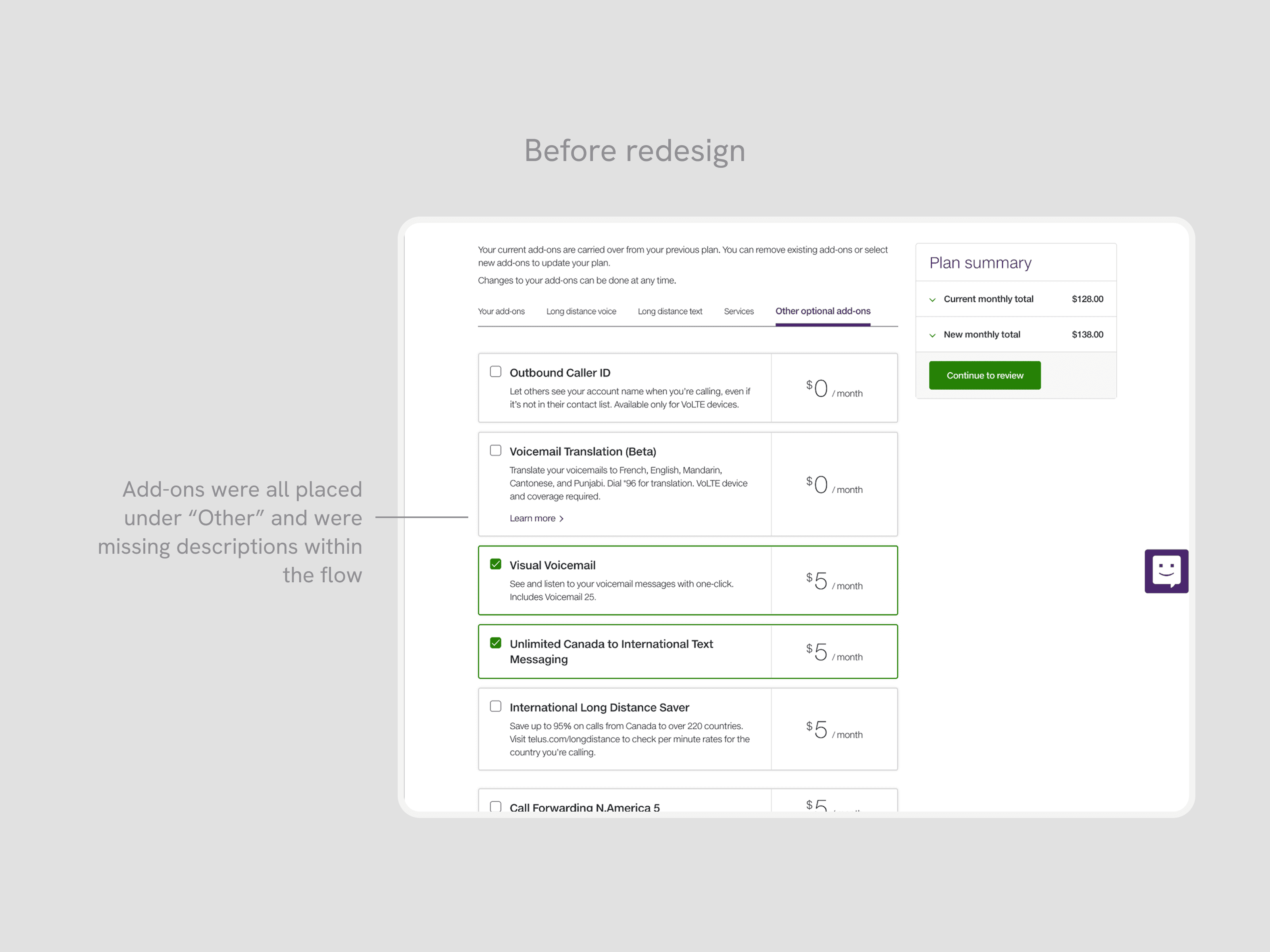Most add-ons were categorized incorrectly into the "Other" category, making it difficult to filter through the right features that a customer needed. For the most popular add-ons, which were Long Distance features, the list of included countries were not easy to find, taking them out of the experience into a new tab to manually search.