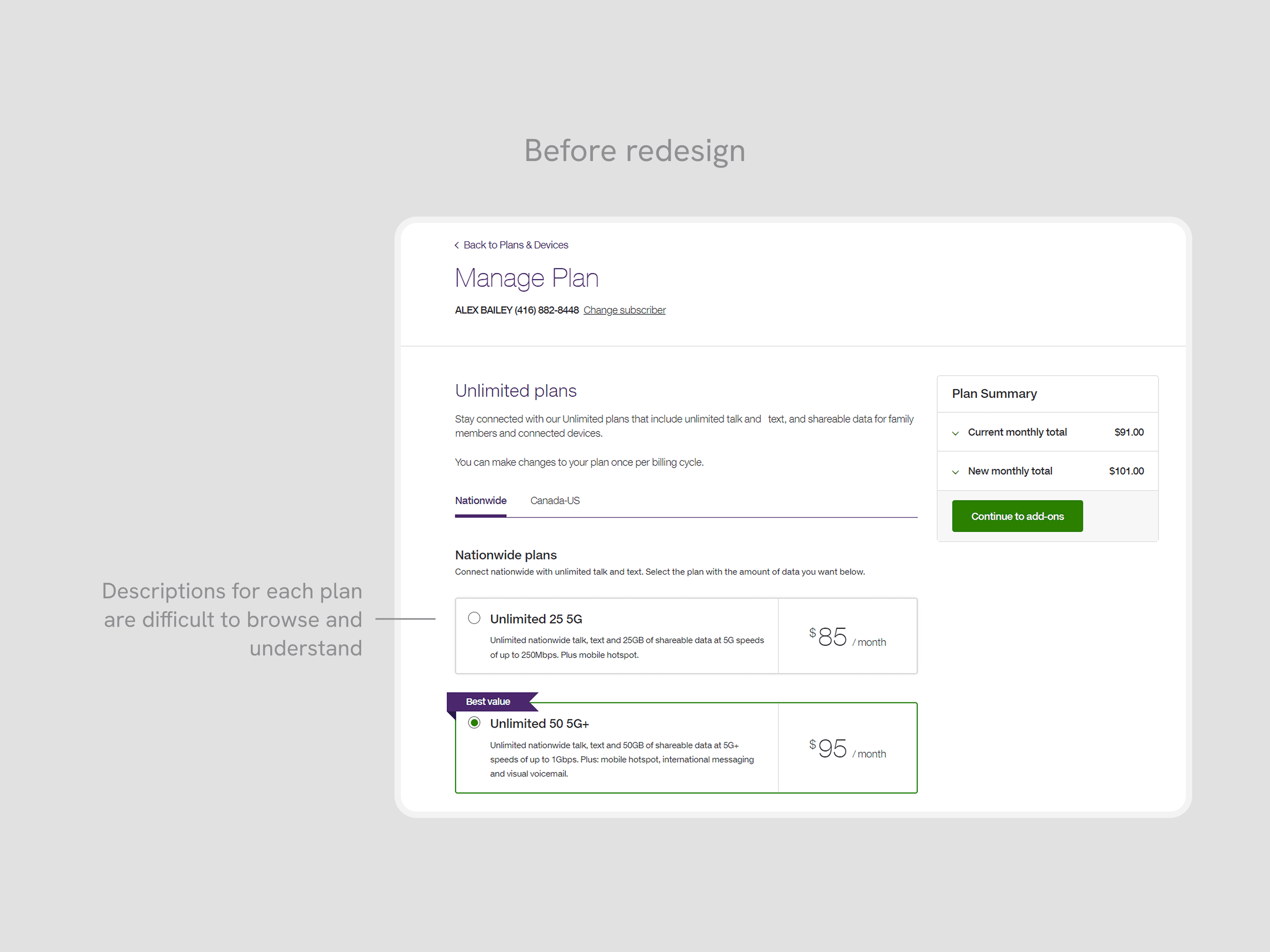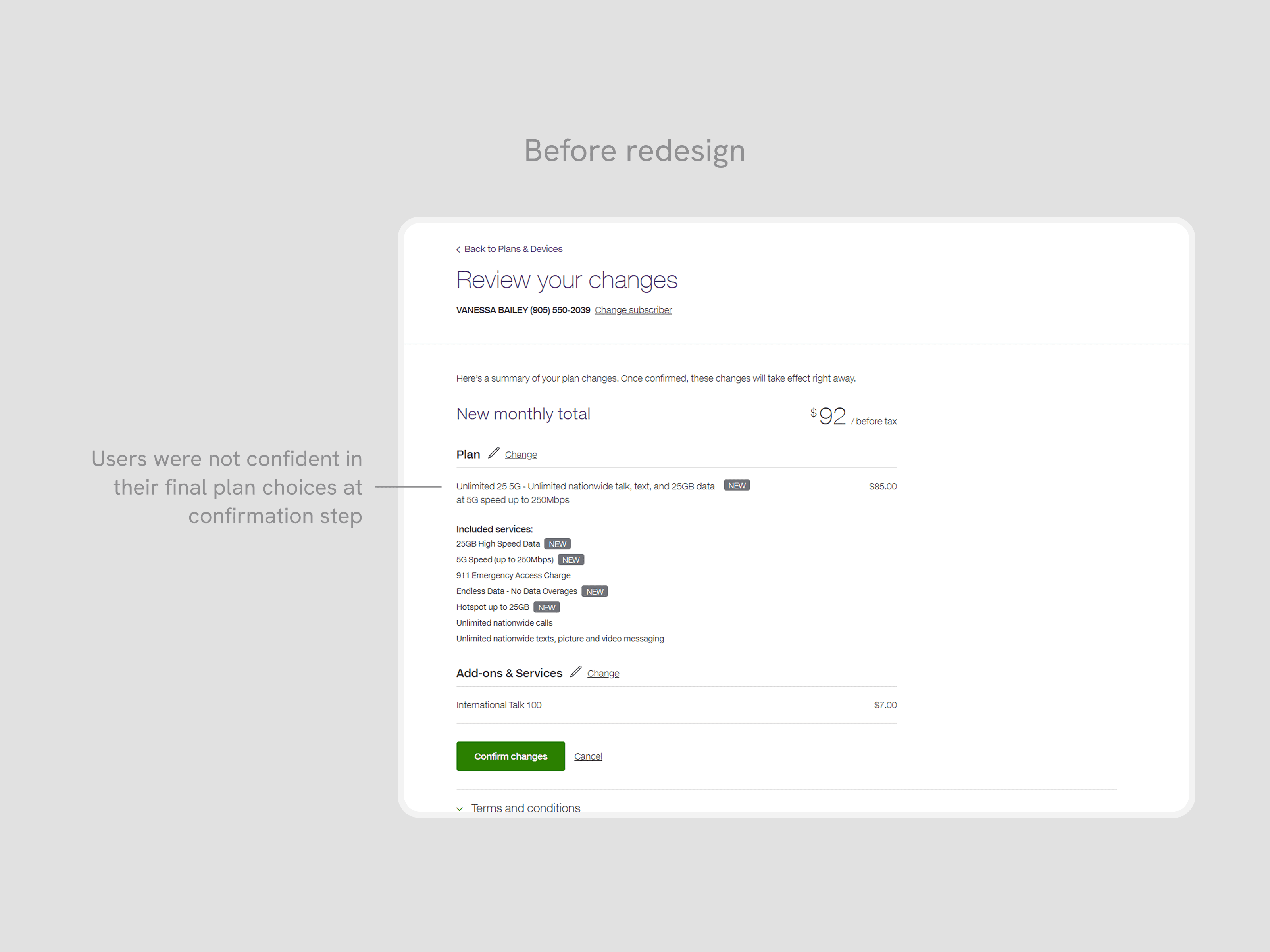 On the last step, customers were unconfident about the changes they selected, and how it differs from their existing plan. This hesitation resulted in a high chance of drop-off, right before submitting their changes.