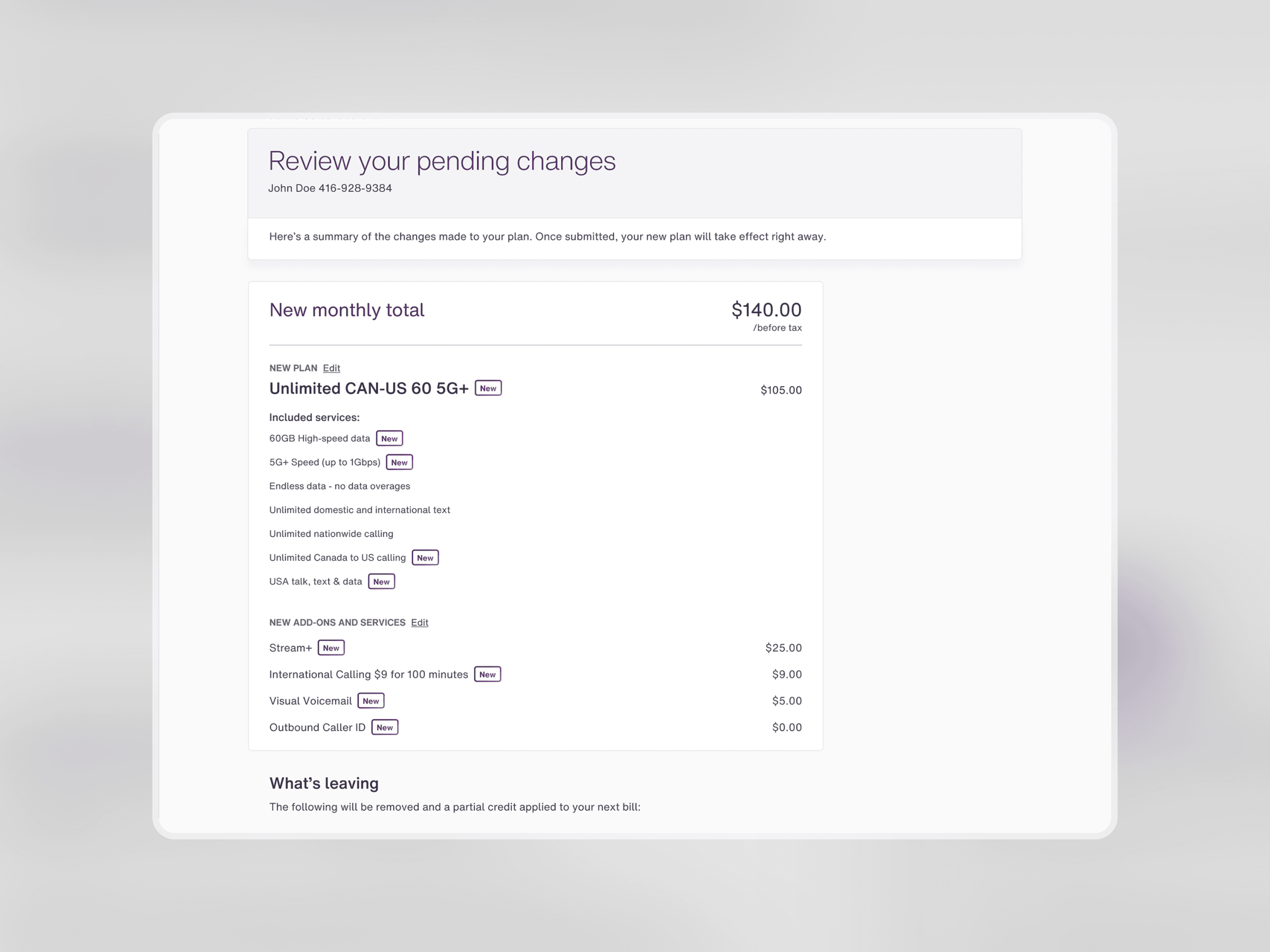 The confirmation page leverages an updated version of the New badge to highlight any new products with a bright purple gradient. We added a new dedicated section to show which features have been removed from their new plan, allowing them to clearly see what is new and what is leaving, once they select Confirm.