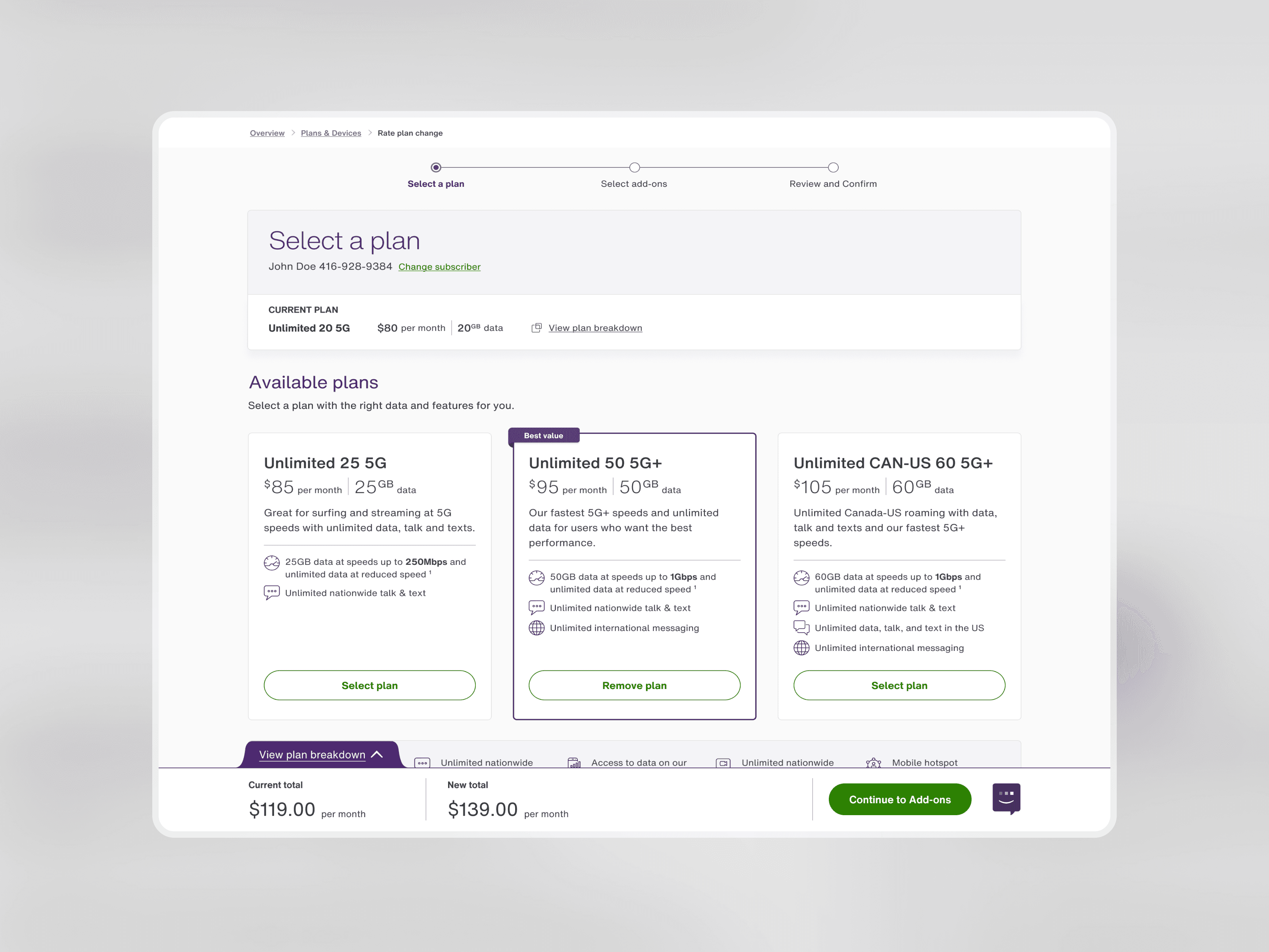 The rate plan change flow allows customers to modify their monthly phone plans and add-ons online—offering a convenient alternative to visiting retail stores. This self-serve option not only enhances user convenience but also reduces support call volume, which can cost the business up to $16 per call.